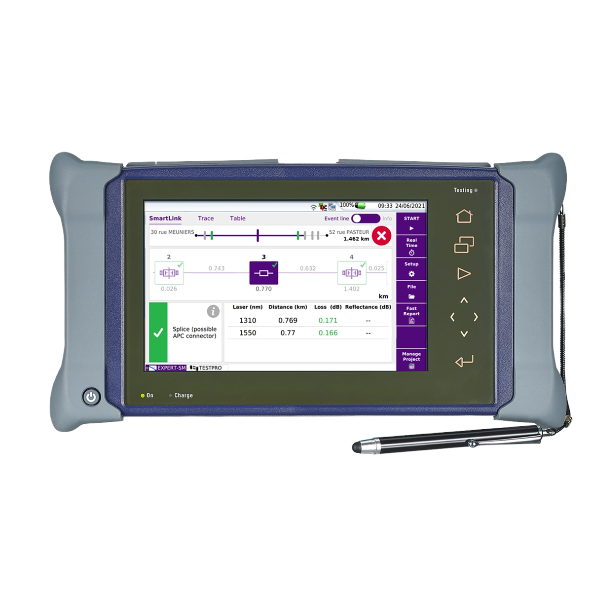 - Simplificación de la interpretación de trazas de OTDR con Smart Link Mapper (SLM), vista basada en iconos del enlace de fibra y aplicaciones específicas para redes FTTH/PON, FTTx (P2P, de acceso y HFC), FTTA, empresariales y de centros de datos